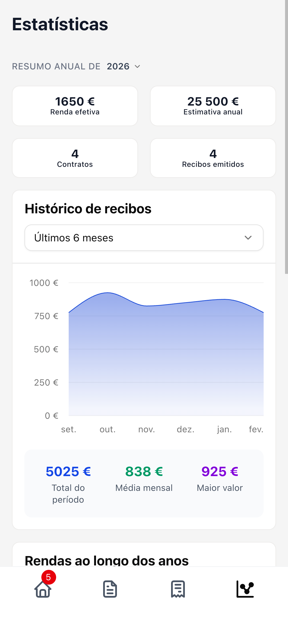 Estatísticas detalhadas sobre rendimentos e recibos emitidos.